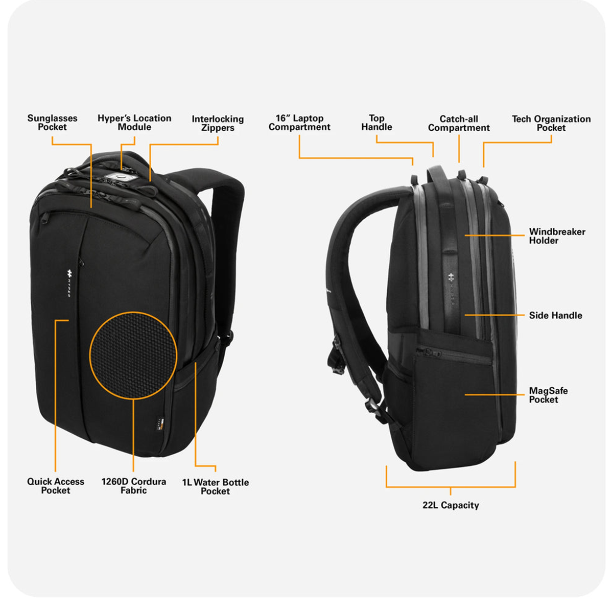 Với dung tích 22L và 6 ngăn riêng biệt, HyperPack Pro cung cấp đủ không gian để mang theo laptop 16″, máy tính bảng 12.9″, thiết bị máy ảnh, kính râm và phụ kiện công nghệ, cũng như bất cứ thứ gì bạn cần khi di chuyển.